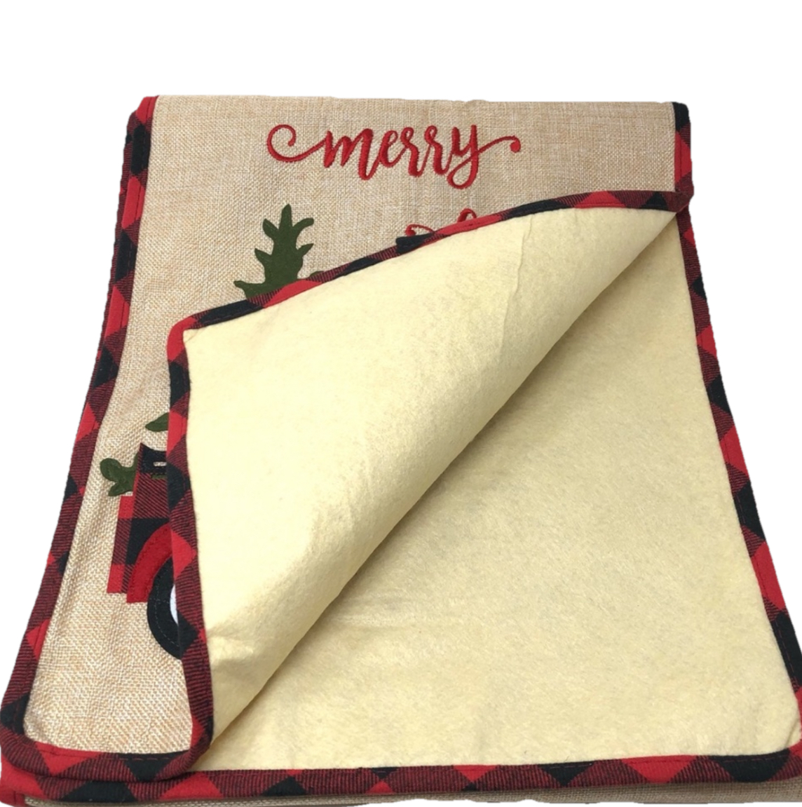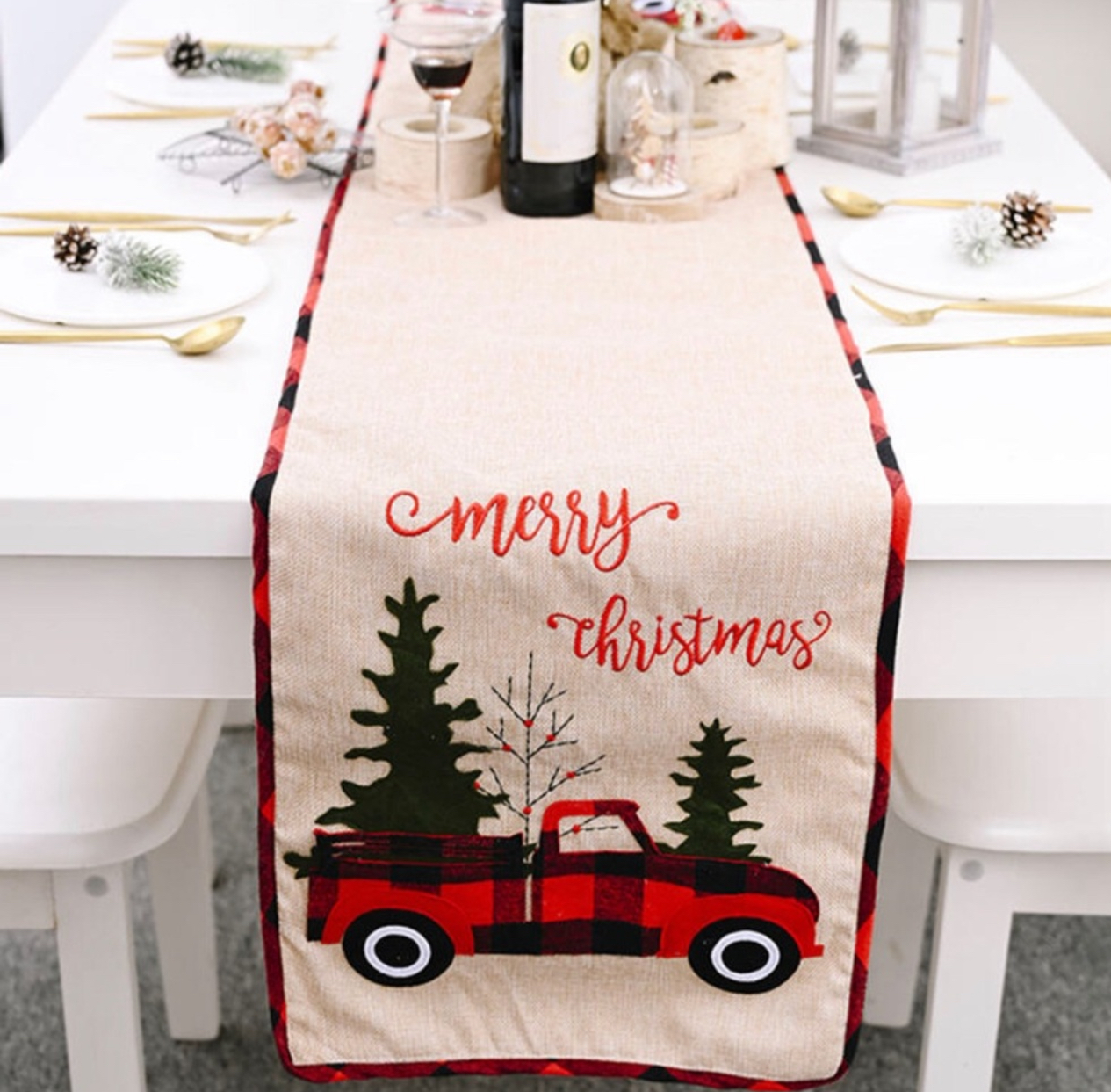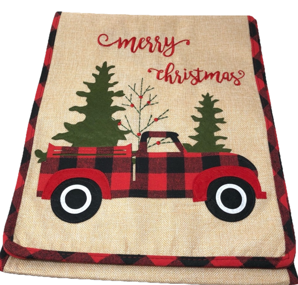 Add a festive touch to your dining table with this Christmas Table Runner featuring a plaid truck and Christmas tree design. Measuring 71 inches in length and 13.5 inches in width, this table runner is made of sack material. The multicolor design is perfect for the holiday season and will complement any table setting.