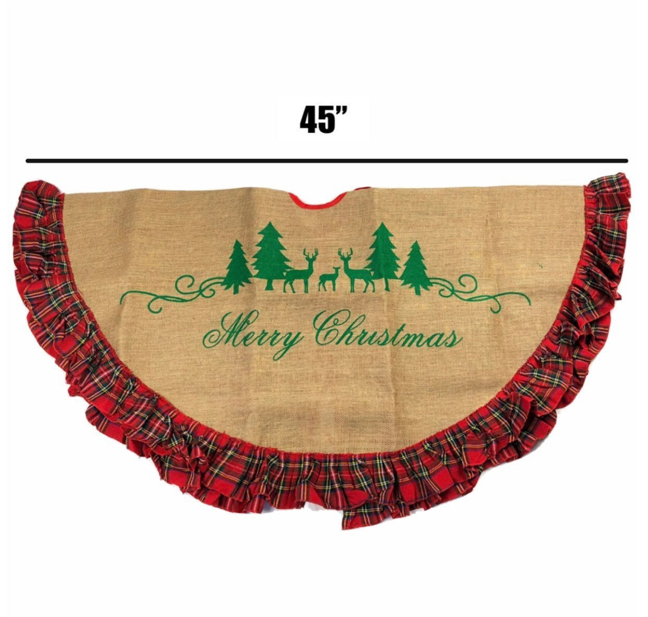 Christmas Tree Skirt Sack material with Green Christmas tree and Reindeer design. Size 45 inch. Great for Holiday Christmas tree decoration.