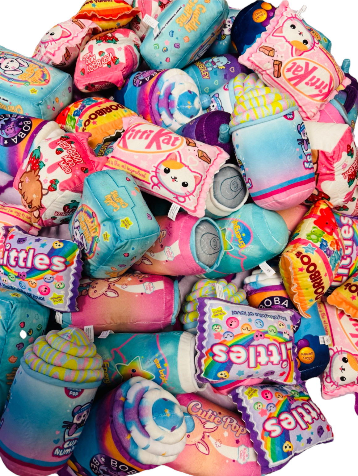 Crane Claw Machine Animal Plush Filler Mix 80 Pieces. Parody theme plush with Funny names like Cuddly Charms cereal, Kitti Kat candy bar, Cup O Num Num, and more!