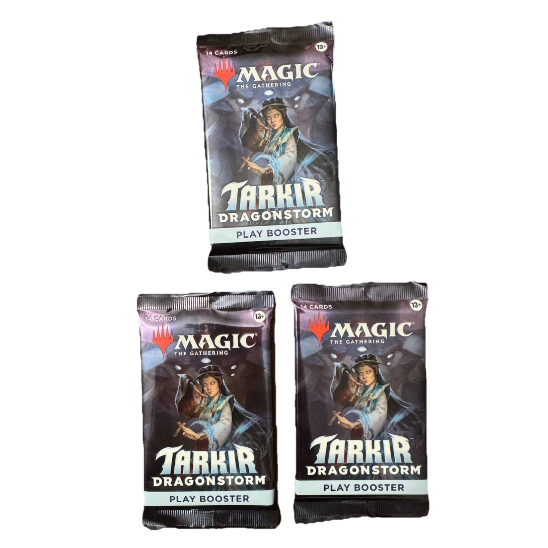 The product is a lot of 3 Tarkir: Dragonstorm play booster packs for Magic: The Gathering. Each pack contains 14 standard-sized cards in English. These booster packs are from Wizards of the Coast and are brand new, sealed pack. Perfect for collectors and players looking to expand their card collection with cards from the MTG Booster Packs set. Recommend for ages 13+